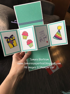 Aren't they fun?? I have to admit, ALL of these products were on my "maybe ... don't flow my hair back" list. I had a LOT of items I was going to buy before I MAYBE bought these ones. Then I gave my head a shake and ordered the lot of them. My thinking ... if *I* wasn't convinced I would use these products then my customers likely weren't either! .... so I challenged myself to buy them, use them and show them off so others could see their potential. Mission accomplished! I DO love them and WILL use them for my upcoming Birthday Stamp-a-Stack event (Sunday, Feb 17th if you're in the Edmonton area and want to attend!). Now because the paper is busier than I tend to like I needed some inspiration on HOW to use these products. Catalogue to the rescue! I actually just copied the projects I saw on page 14 of the catalogue! No need to reinvent the wheel! Start off copying something you see and tweak as needed! I did alter my projects slightly from the catalogue projects and love how they turned out!